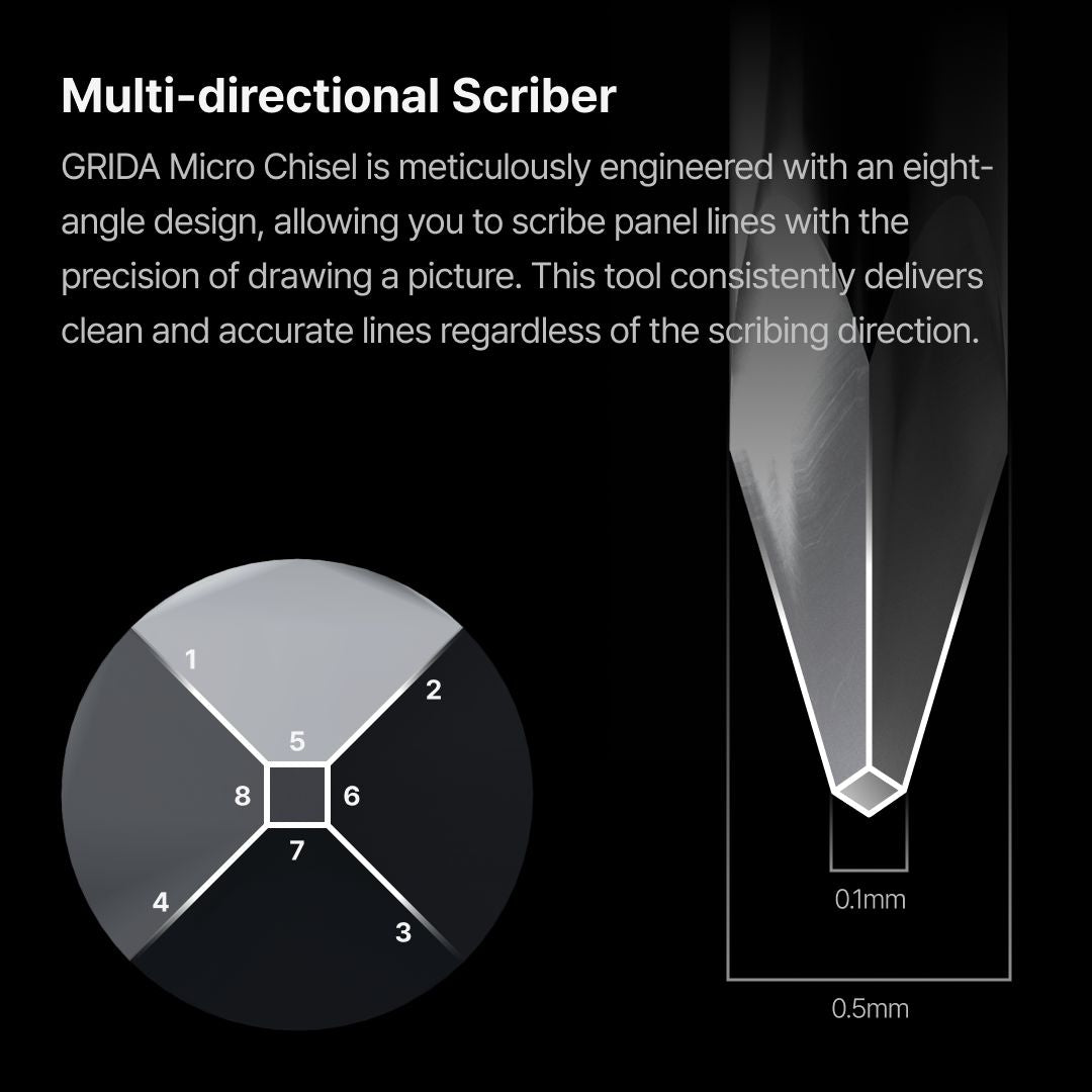 GRIDA is a multi-directional MICRO CHISEL with a practical mechanical pencil scriber for panel line scribing from novice to expert. It's specialized for deeper and cleaner re-scribing panel lines. GRIDA Micro chisel's multi-directional technology is stable when scribing on flat, curved, or irregularly shaped surfaces. It can scribe between 0.15mm to 0.20mm lines and up to 0.30mm by scribing multiple times.