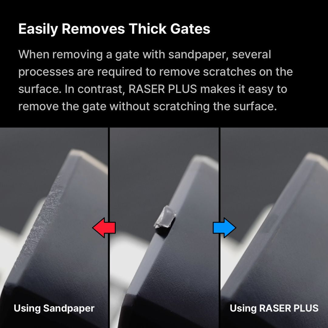 RASER PLUS specializes in thick gate removal using its proprietary Super-Nano Technology, which provides a powerful sanding experience without leaving scratches on the surface. Its 5mm thickness is suitable for a more stable and better grip working on large parts with thick gates, making this tool a perfect solution for removing gates.