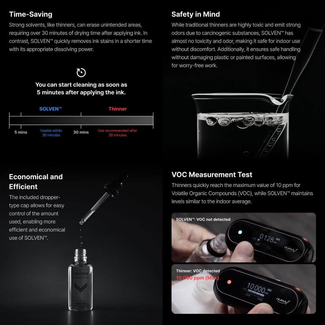 SOLVEN™ is a colorless and odorless solution specifically formulated for panel line cleaning. Unlike traditional enamel thinners, which often leave smudges due to their continuous dissolving action, SOLVEN™ effectively dislodges cured ink without smearing, ensuring a clean finish every time. Its balanced dissolving power enables rapid ink stain removal, eliminating the long drying times typically associated with conventional thinners.
