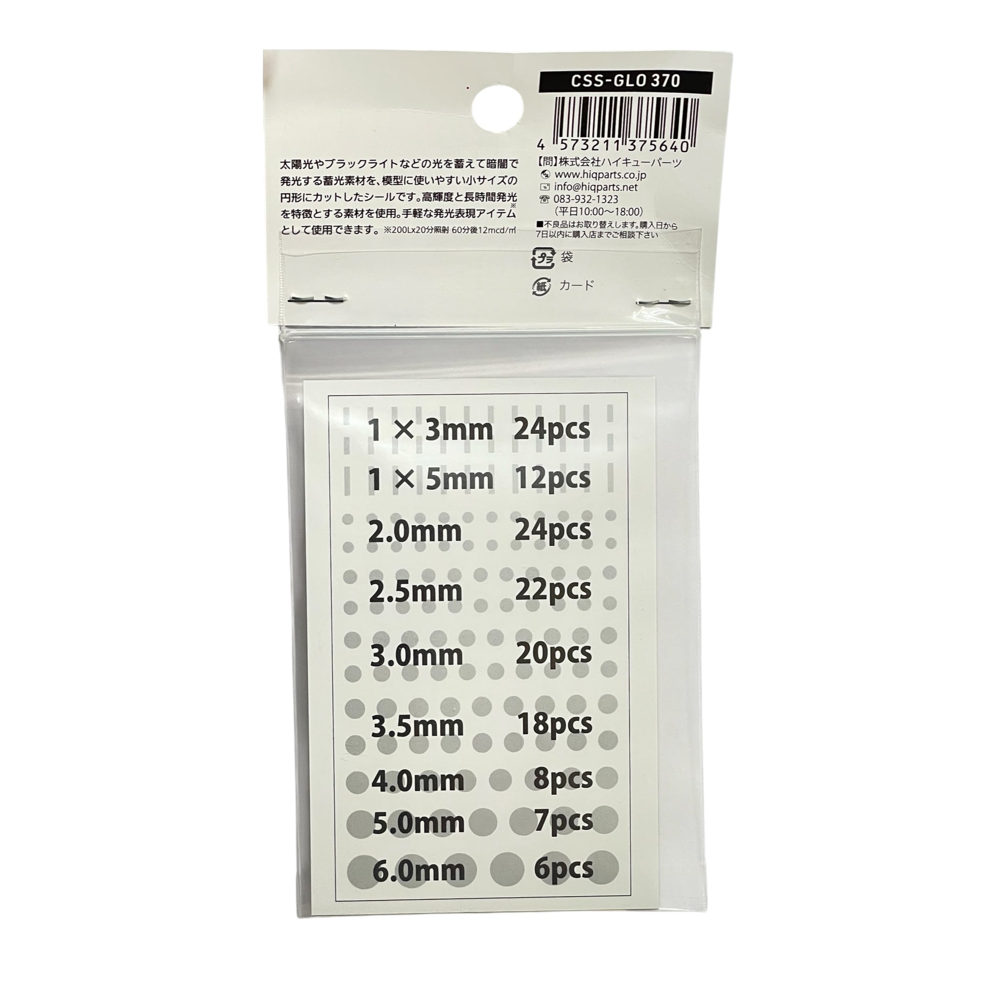 It is a sticker cut into a small circular shape that is easy to use for models, using a light-sto-recersort material that stores light such as sunlight and black light and emits light in the dark. Using materials characterized by high brightness and long-term light emitting. It can be used as a simple luminous expression item. When peeling off the seal, you need a thin tweezer at the tip.