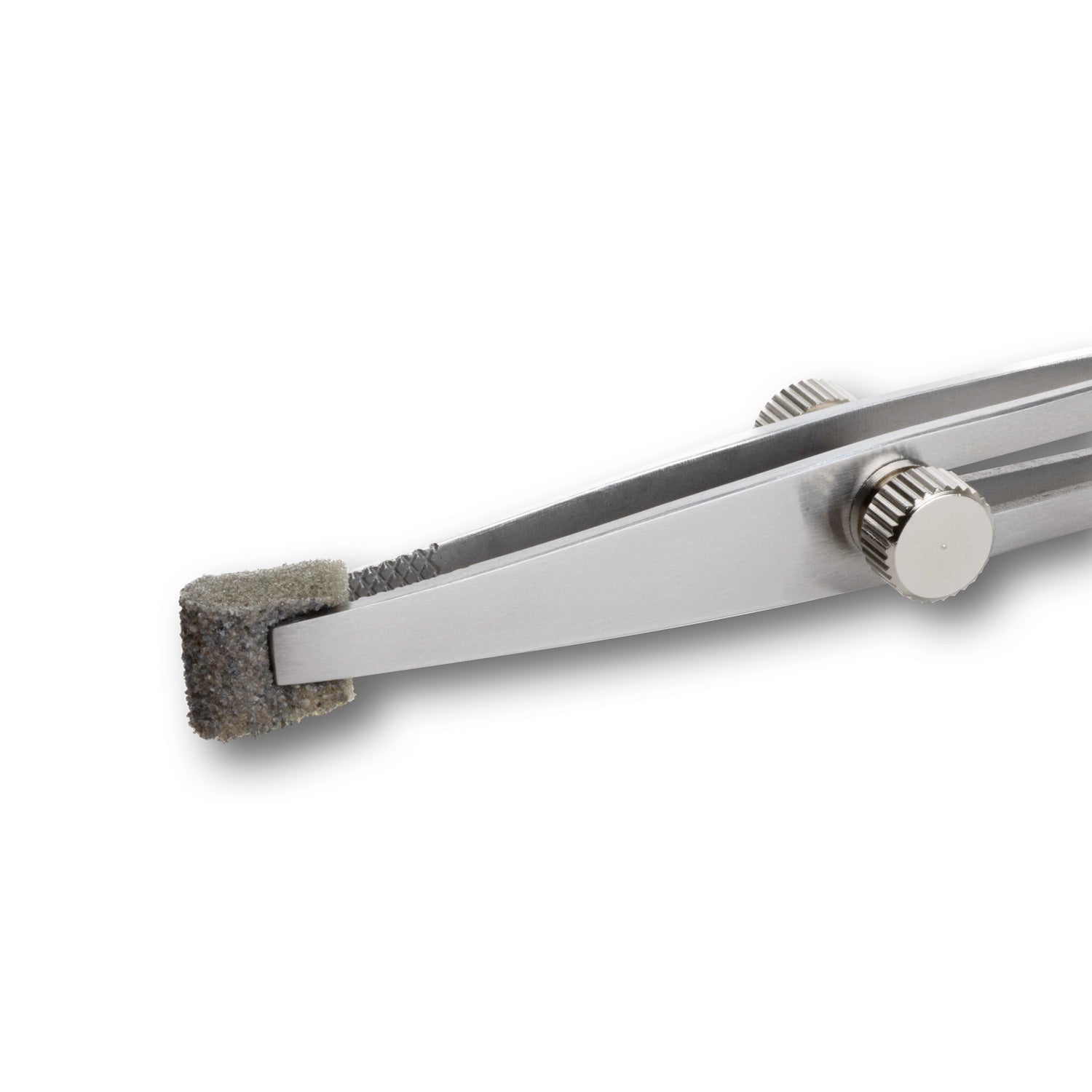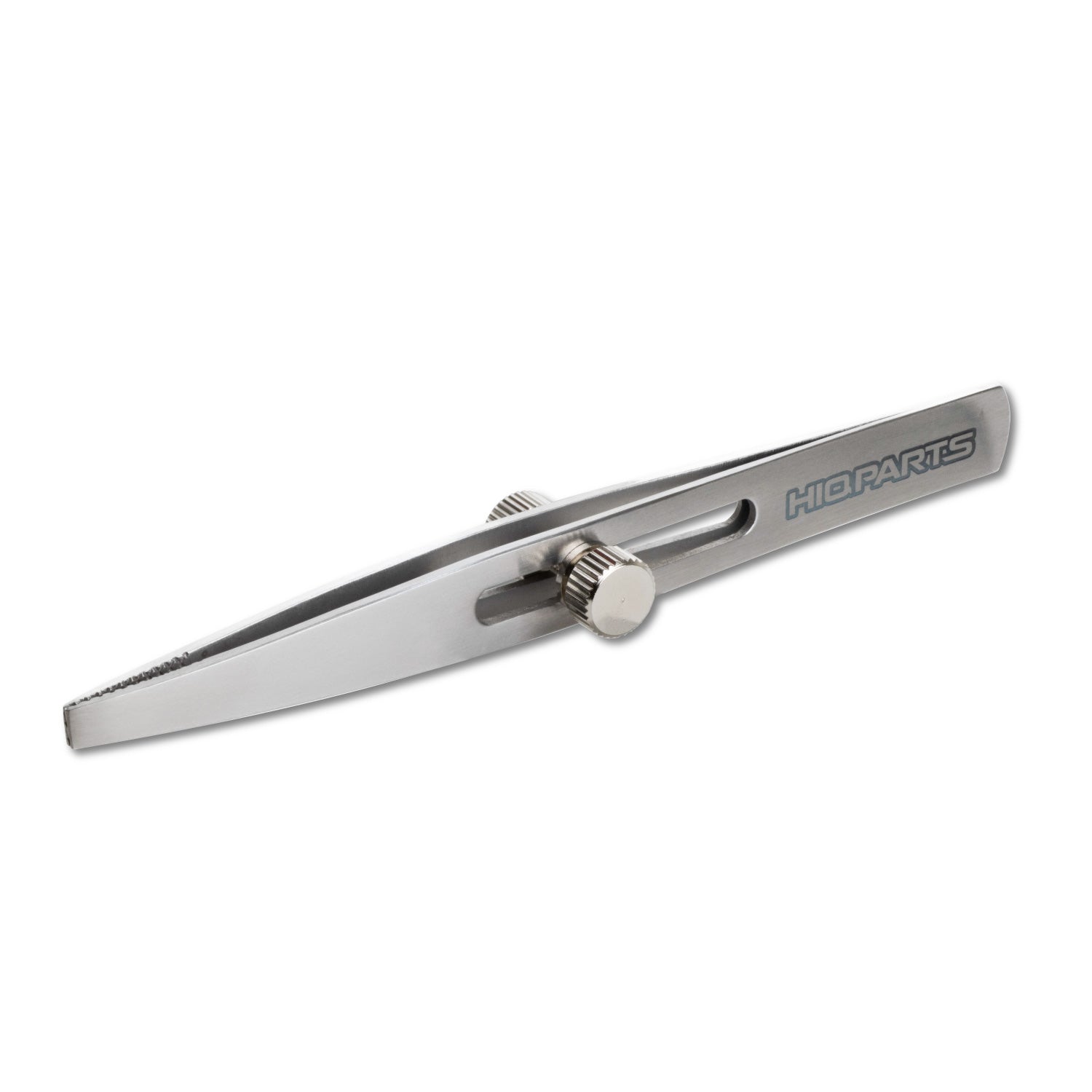 Tweezers with a sliding lock mechanism for filing that can hold paper files and sponge abrasives with one touch at the tip. With a non-slip and strong tightening mechanism, you can work with force without the abrasive slipping. If you slide the decorative screw and nut (hereinafter referred to as the screw) for the lock towards the tip, you can hold it with one touch while it is clamped. On the contrary, if you slide it towards the rear end, you can release the sandwiched one. The pinch strength can be changed depending on the tightening condition of the screw. If you want to tighten it harder, adjust the distance of the screws to a narrower way. Patent No. 6583835