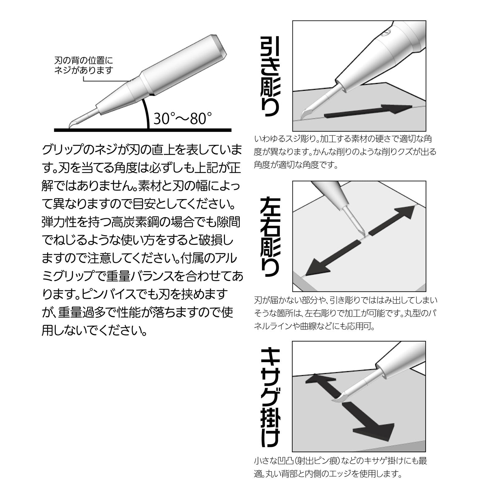 We have designed a special slim grip so that you can hold it like a pencil. Because it can be grasped smoothly to the part close to the blade, it is characterized by ease of handling like handling a pencil. Matte anodized treatment is used to prevent the lighting from reflecting on the tool and making it difficult to see. The included aluminum grip matches the weight balance. You can pinch the blade even with a commercially available pin vise, but please do not use it because it will lose performance due to excessive weight.