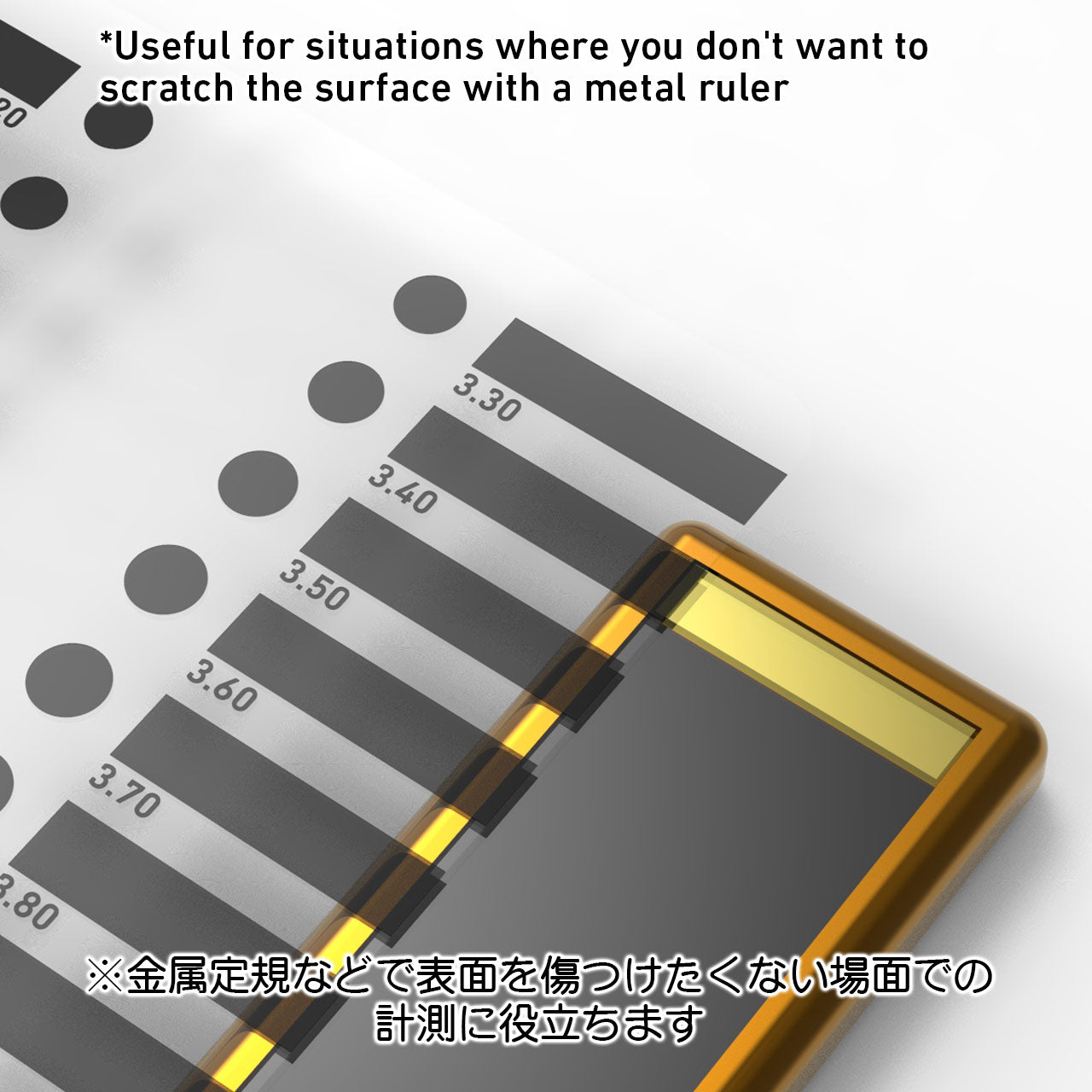 It is a tool that measures the width of the groove by printing the actual line width on a transparent material. If you want to re-carve the groove applied to the plastic model with a tool, but you don't know which width of the tool will fit, put it on top of the place you want to measure as shown in the figure and check the size of the matching width. You can upgrade to a more accurate measurement from the work that was actually examining by putting the tool on the groove.