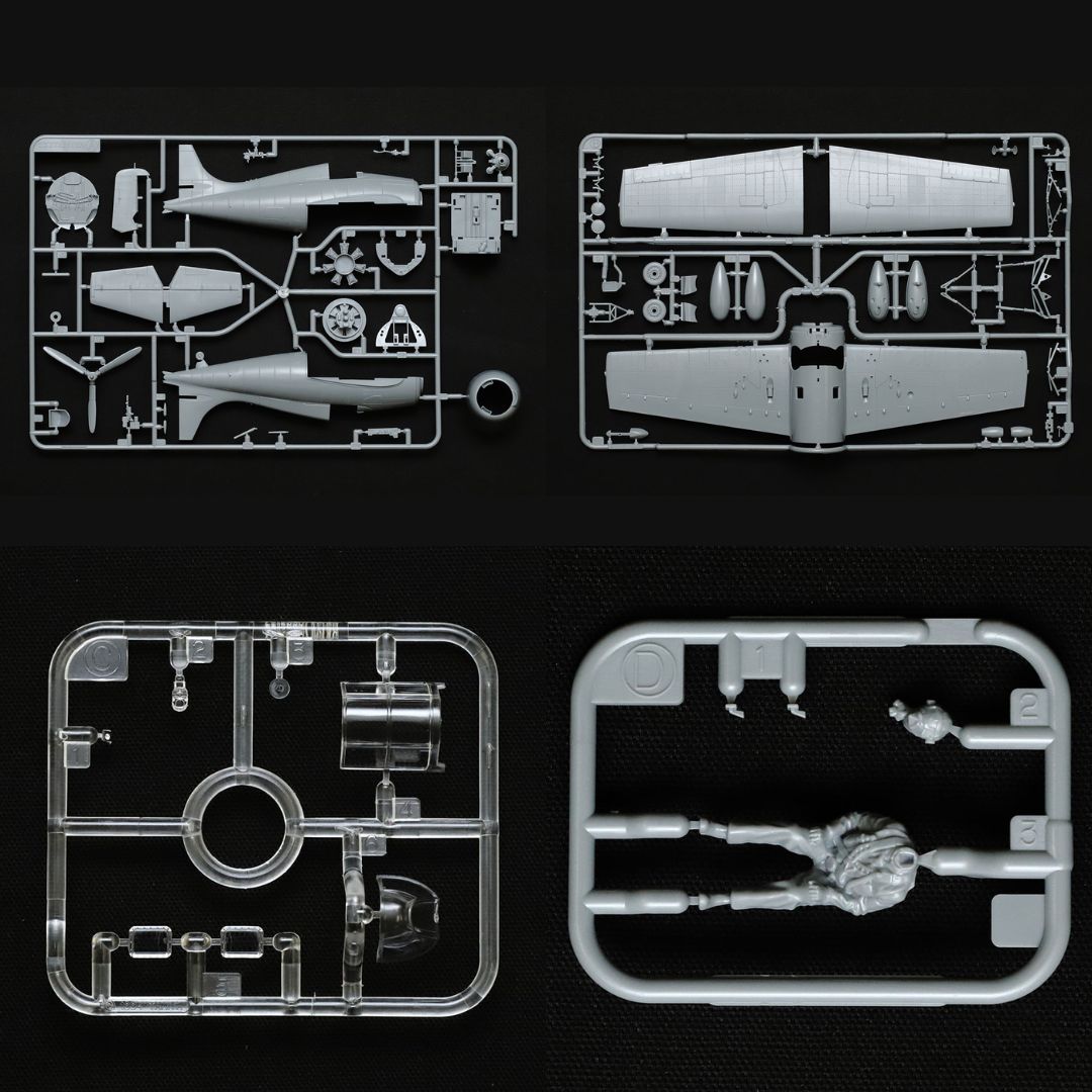 • Masking stickers for the canopy, one sitting pilot figure and black-and-white painting guide are included.
