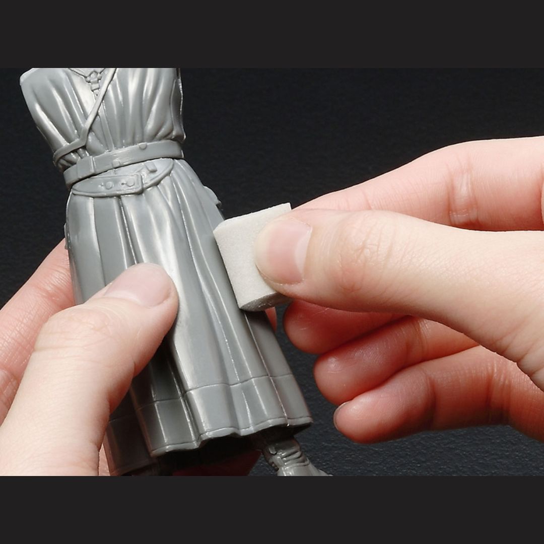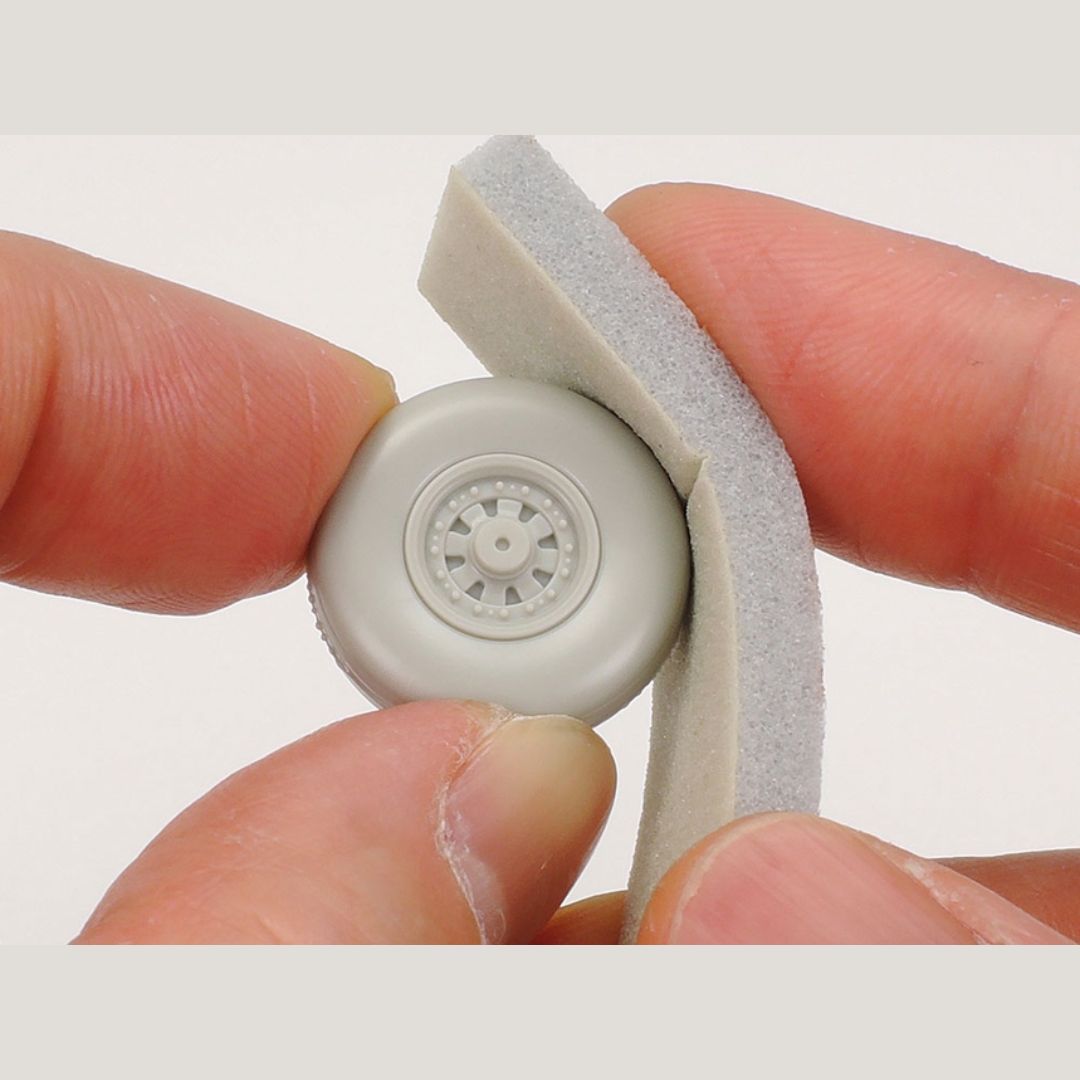 Attached to a flexible sponge base, the abrasive coat of this sanding sheet is well-suited for removing protrusions on plastic models and also finishing materials such as wood and metal. The sponge's flexibility allows even finishing of curved surfaces and hard-to-reach corners. This item can be easily cut into the desired shape/size using a modeling knife. Note: Suitable for wet sanding use.