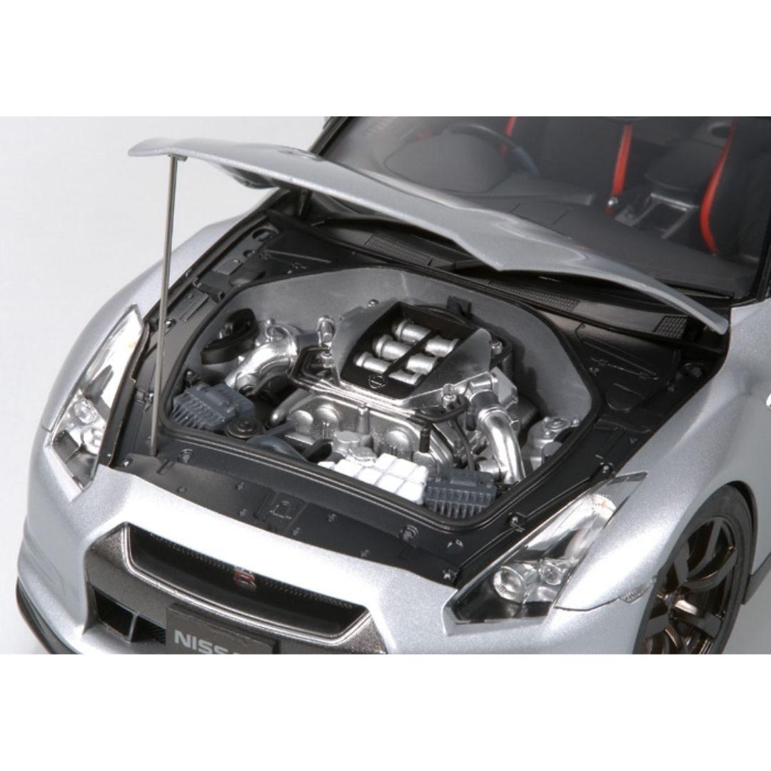 【 About the Model 】★1/24 scale high-quality assembly kit. ★Length: 197mm, Width: 82mm ★Aggressive form of the GT-R accurately captured. ★Suspension and interior components are assembled in a similar way as the actual car. ★Metal plated induction box add detail to the engine bay. ★Window masking stickers included. ★Metal transfers sharply reproduce manufacturer emblems and side mirror surfaces. ★Metal plated 2-piece wheels are just like the real thing.